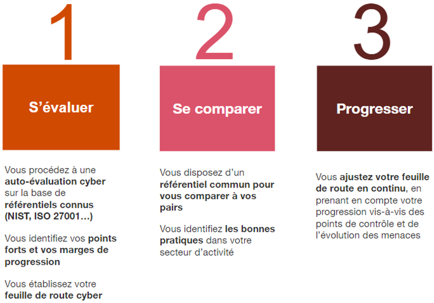 En réalisant votre évaluation cyber autour de référentiels reconnus, vous vous offrez également la possibilité de vous comparer à d’autres entreprises, dans votre secteur d’activité ou de taille similaire. Ainsi, vous établissez des comparaisons constructives, vous identifiez les bonnes pratiques de votre secteur et vous vous inspirez des best in class pour progresser.